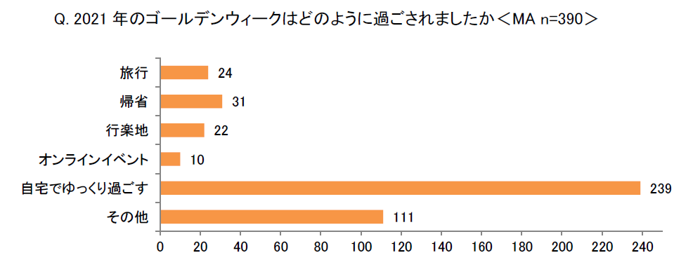 「2021年のゴールデンウィークはどのように過ごされましたか<MA>」という問では、「自宅でゆっくり過ごす」(239)が圧倒的に多い結果となりました。コロナ禍で全国的に都道府県間の移動自粛を求められていたこともあり、旅行や帰省を控え、自宅で過ごした家庭が多いことが分かります。