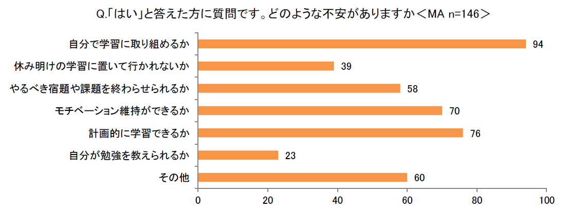 「子どものゴールデンウィークなどの長期休暇における学習に関する不安はありますか<SA>」という問に、約4割が「はい」(146)と回答しました。「どのような不安がありますか<MA>」では、第1位が「自分で学習に取り組めるか」(94)となり、第2位「計画的に学習できるか」(76)、第3位「モチベーション維持ができるか」(70)と続きました。TVやゲームなどの誘惑が多い環境下で、子どもだけで、モチベーションを維持したまま計画立てて学習を進めることに不安を抱いていることが伺えます。