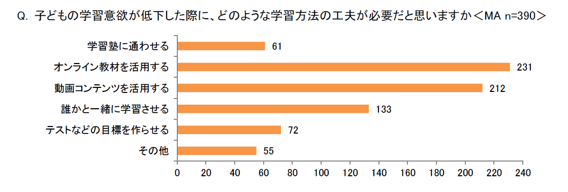 「子どもの学習意欲が低下した際に、どのような学習方法の工夫が必要だと思いますか<MA>」という問では、第1位が「オンライン教材を活用する」(231)、第2位が「動画コンテンツを活用する」(212)となりました。コロナ禍という特殊な環境下において、オンライン教材や動画などのITを活用した学びが、これまで以上に求められていることが伺えます。また、自宅で一人での学習が必要な中、デジタル活用による学習意欲を向上させる学びの提供が重要だと考えられます。