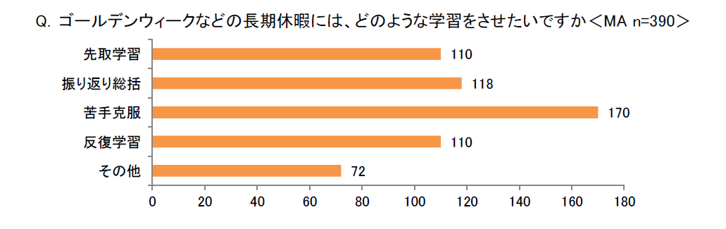 さらに、「ゴールデンウィークなどの長期休暇には、どのような学習をさせたいですか<MA>」では、「苦手克服」(170)が最も多く、次いで「振り返り総括」(118)となりました。また、約3割は「先取学習」(110)、「反復学習」(110)にも関心があることが分かりました。時間がある長期休暇だからこそ、普段できない課題に取り組み、学習を深堀して欲しいと考えていることが見て取れます。