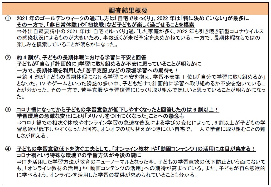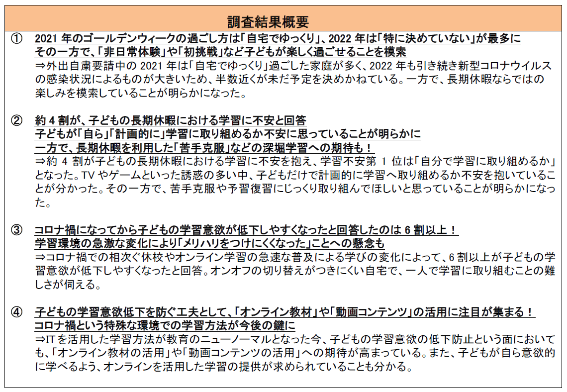 今回、イー・ラーニング研究所では20代~50代の子どものいる親を対象に「2022年:ゴールデンウィークなどの長期休暇の学習に関する調査」を実施いたしました。その結果、長引くコロナ禍でなかなか予定が立てづらいものの、長期休暇ならではの楽しみ方を模索し、さらに、長期休暇を利用した深掘り学習への期待を抱いていることが分かりました。一方で、急速なオンライン普及など、環境変化のもとでの子どもの学習意欲低下に関する懸念も判明し、ITを活用した学習方法へのさらなる期待が見て取れる結果となりました。