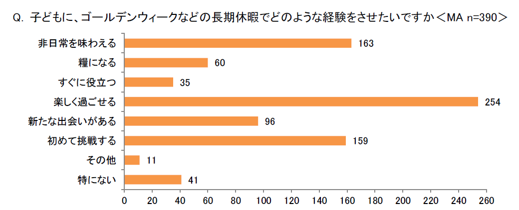 また、「子どもに、ゴールデンウィークなどの長期休暇でどのような経験をさせたいですか<MA>」という問では、「楽しく過ごせる」(254)が最多となり、次いで、「非日常を味わえる」(163)、「初めて挑戦する」(159)と続きました。コロナ禍で我慢を強いられ、不自由なことも多い学校生活の中で、せめて休暇中は楽しく過ごしてほしいと思っていることが分かります。さらに、長期休暇だからこそ、非日常や初挑戦などの、普段とは異なる経験をさせたいと思っていることも伺えます。