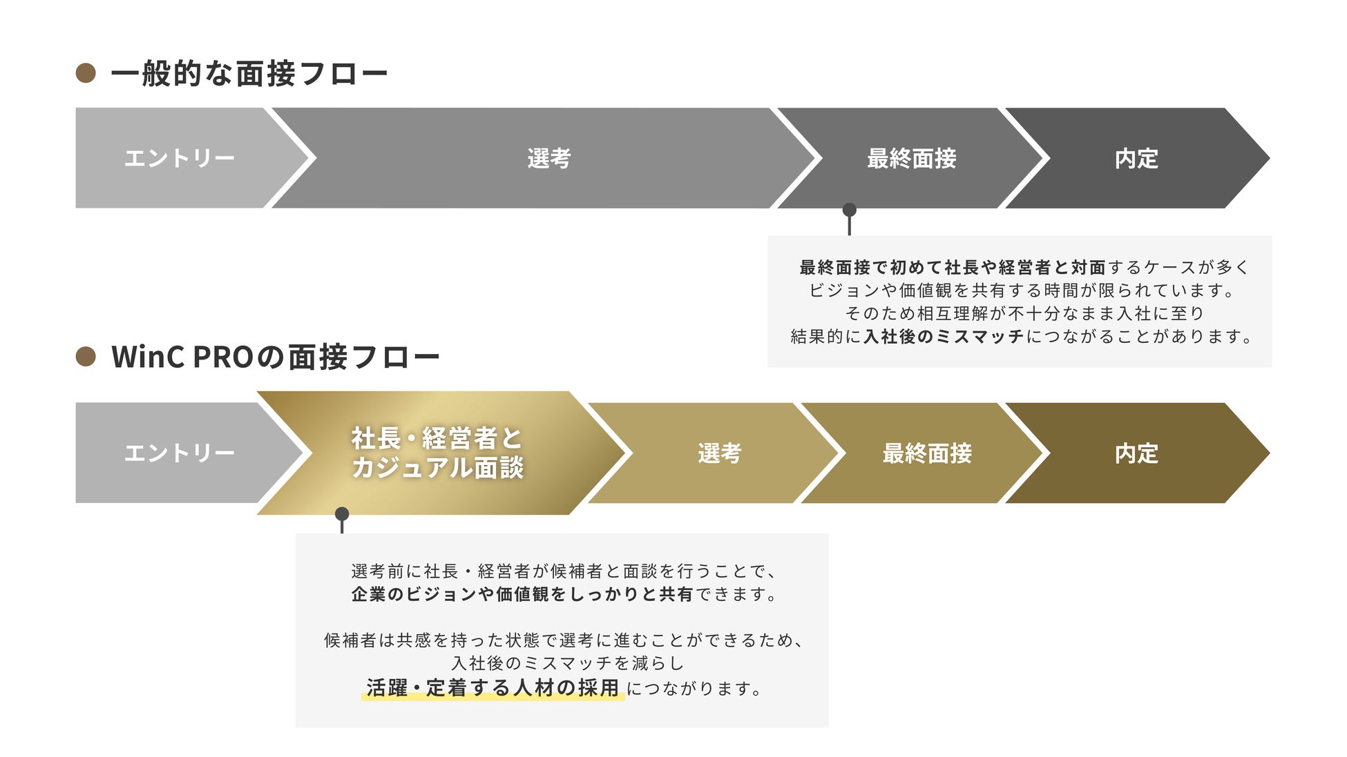 この「社長就活」の考え方を転職市場にも広げ、条件だけに左右されない納得感あるキャリア選択を支援するために生まれたのが「WinC PRO」です。