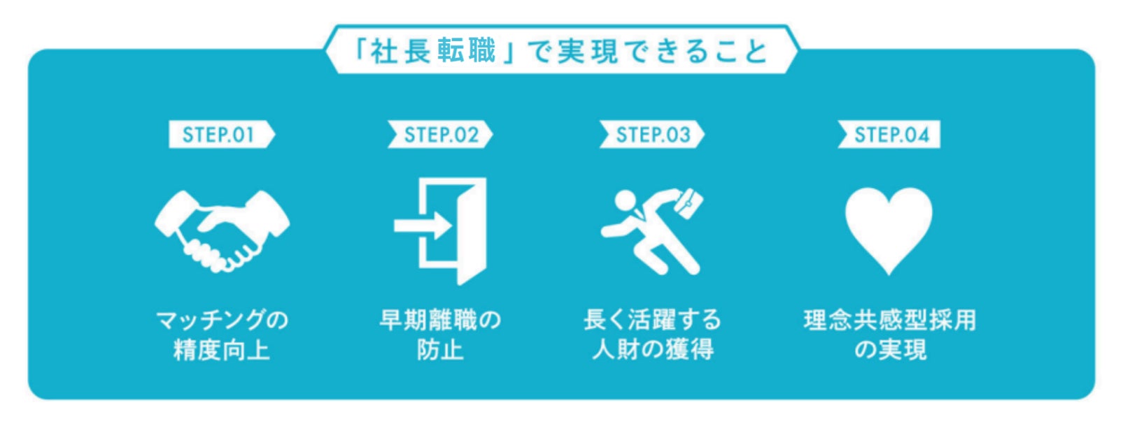 「社長転職」は、企業の経営者と直接対話することで、「誰と働くか」「どんな想いで働くか」といった価値観を深く理解したうえで転職先を選べる、新しい形のマッチング手法です。企業理念やビジョンへの共感を軸に入社を決めることで、雇用のミスマッチを減らし、入社後の活躍や定着といった“採用の本質的な成功”につなげていきます。