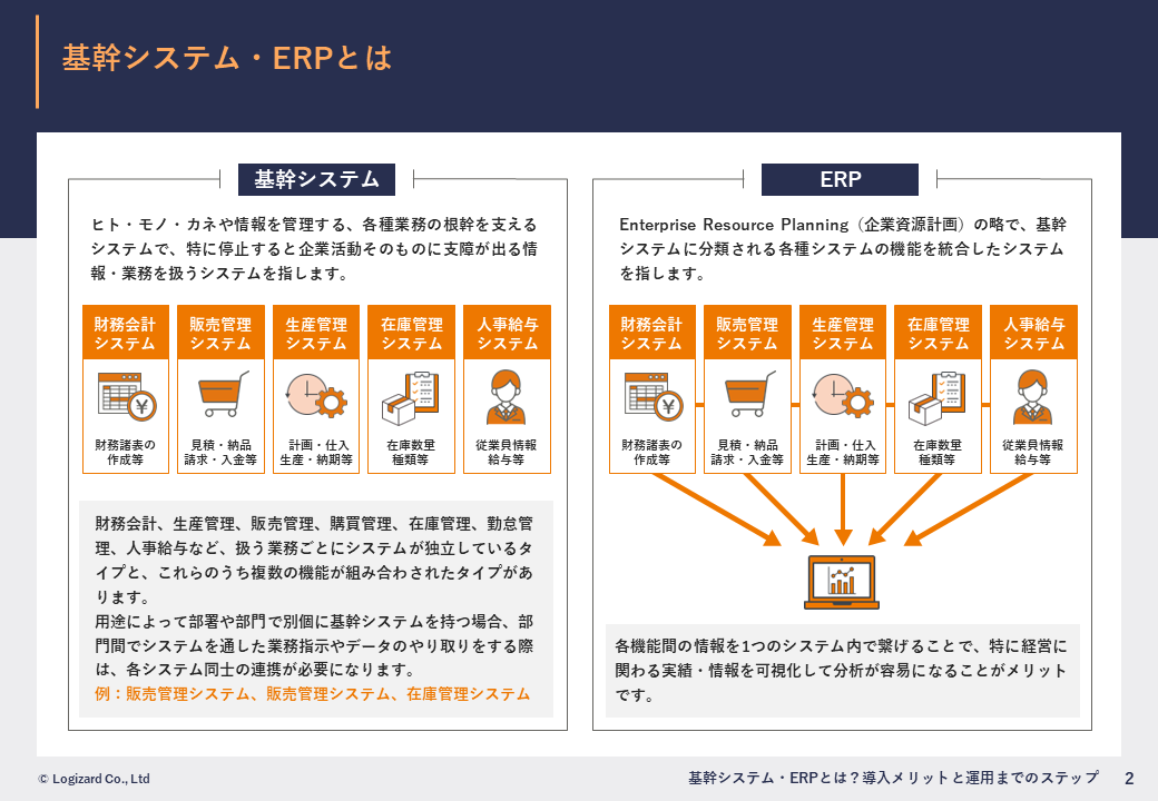 この資料では、基幹システムやERPの導入を検討している方に向けて、基幹システムとERPの違いや導入のメリットから、選定・導入のステップ、周辺システムと連携して活用する事例について解説します。