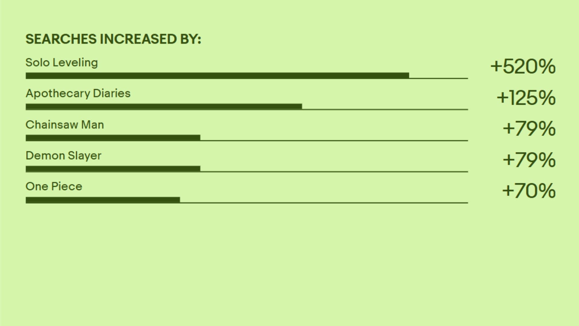 例えば、日本発信の漫画やアニメ、トレーディングカードに代表されるエンタメ文化が世界各地で高い人気を誇っており、「Solo Leveling(俺だけレベルアップな件)」(約520%増加)や「Apthecary Diaries(薬屋のひとりごと)」(約125%増加)、「Chainsaw Man(チェンソーマン)」(約79%増加)、「Demon Slayer(鬼滅の刃)」(約79%増加)、「One Piece(ワンピース)」(約70%増加)など、漫画の発売やアニメの公開に合わせて、タイトル検索数を大きく伸ばしました。