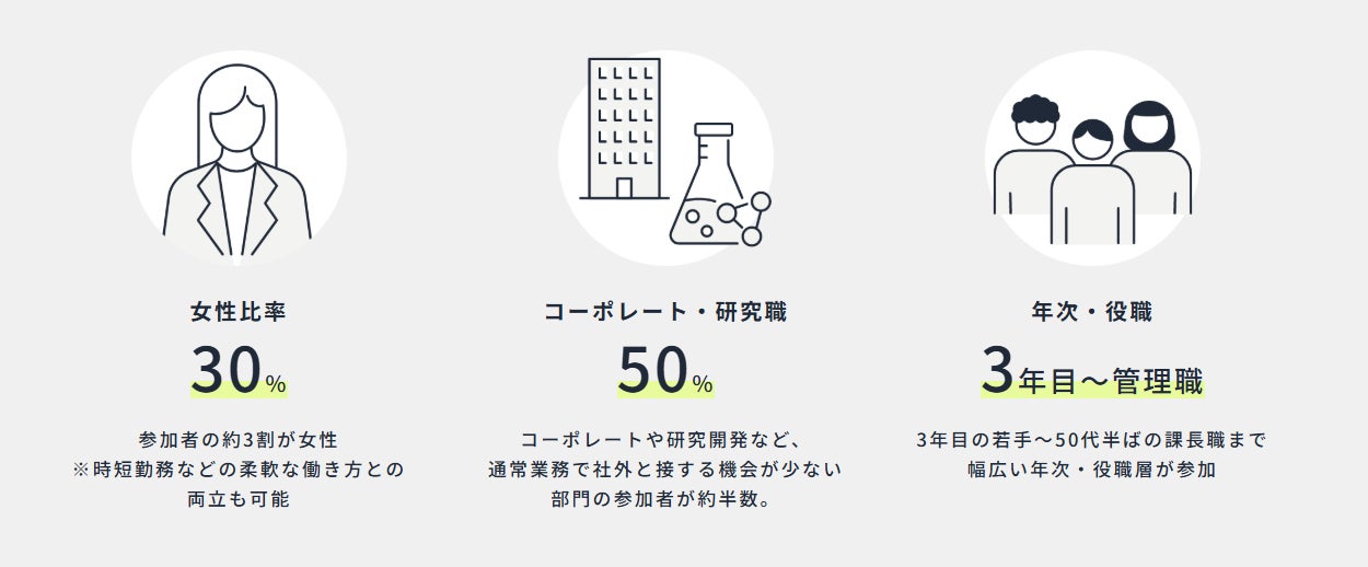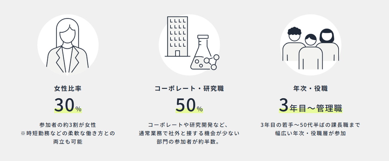業務時間の20%を活用するため、現業を離れることなく社外のプロジェクトに参画することが可能。そのため環境を全く変えた挑戦をしにくい女性や管理職のほか、またコーポレート部門から新規事業部門まで幅広い社員が本プログラムに参加しています。またプロジェクト参画中から経験を言語化し振り返りを行うため、学びを適宜チームに還元できることも評価されています。