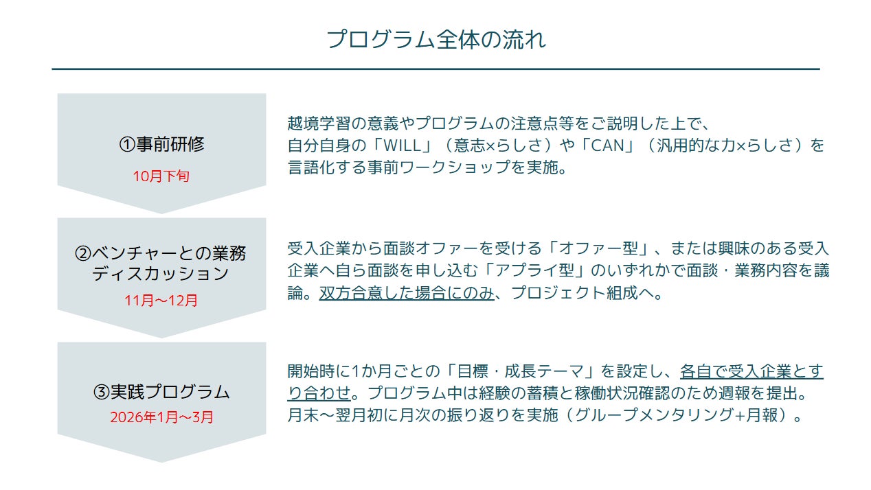 現在、8社から34名がプログラムへの参加を予定しています。参加者は10月に参加企業合同でのキャリア開発を含む事前研修を終え、11月よりベンチャー企業との面談をスタートします。ベンチャー企業と業務内容の合意に至った参加者は、業務時間の「20%」を活用し、2026年1月〜3月の3か月間、ベンチャー企業において業務を実践します。