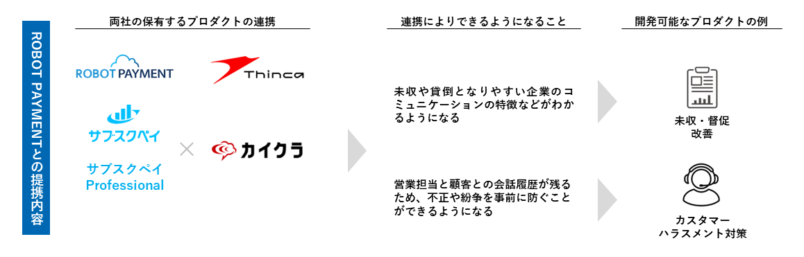 この「カイクラ」とROBOT PAYMENTの決済プロダクトを連携させることで、未収金・貸し倒れが発生しやすい企業のコミュニケーション特性を把握し、ハラスメント対策などを含めた新たなサービス開発を目指します。