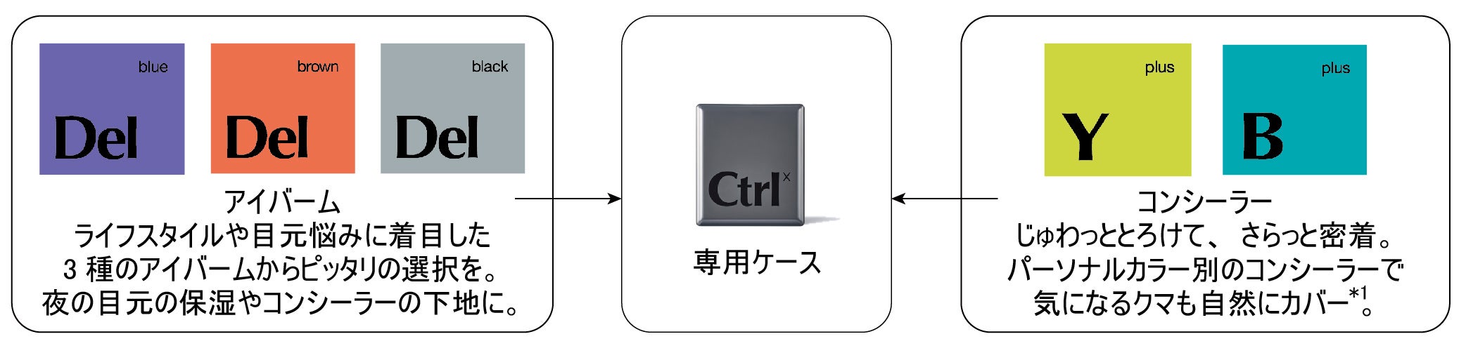 「Ctrlx(コントロールバイ)」は、パソコンのショートカットキーに着想を得て、年齢や性別を問わずスキンケアやメイクにかける“時間をショートカットする”ことにより生まれた時間を楽しんでほしいという願いを込めたブランドです。今回開発した商品は「がんばりすぎない目元ケア」をコンセプトとし、目元の悩みに合わせた目元ケア用のアイバームと肌の色味に合わせたコンシーラーを組み合わせることが特徴です。パソコンのCtrlキーとアルファベットキーを組み合わせて入力することで様々な操作を素早く行うように、目元ケア用のアイバームとコンシーラーの組み合わせでさっと目元を整えることができます。