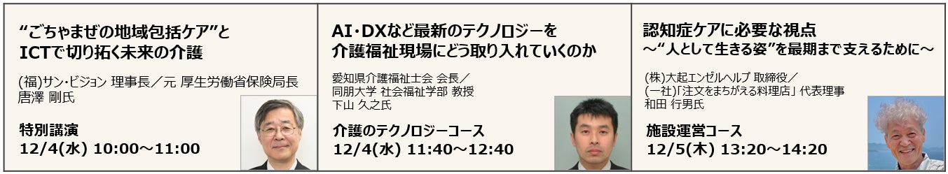 本展では、業界の第一線で活躍する専門家を講師に迎えた「専門セミナー」を同時開催する。特別講演では、元厚労省保険局長の唐澤剛氏が登壇。介護のテクノロジーコースでは、愛知県介護福祉士会 会長の下山久之氏が最新テクノロジーを現場に導入する際のポイントを解説。その他、稼働率アップや業務改善の具体策、次世代リーダー育成、日常の介護でとり入れたいフレイル予防など、介護の課題解決に役立つセミナーがラインナップされている。セミナー受講に必要な事前申込(無料) は公式サイトにて受付中。定員間近のセッションもあるため、早めの受講申込をおすすめする。