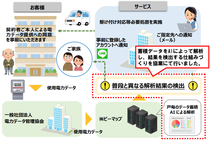 これらが一体となったビーマップの「電力データによる見守りサービス」。協業会社と調整でき次第、順次サービスの提供を開始します。