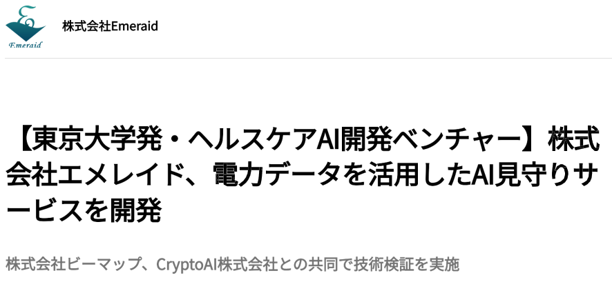 株式会社エメレイド(本社:東京都文京区、代表取締役CEO:島 碧斗、以下 当社)は、株式会社ビーマップ(本社:東京都千代田区、代表取締役社長:杉野文則、以下 ビーマップ)およびCryptoAI株式会社(本社:東京都渋谷区、代表取締役CEO:根路銘 啓、以下 C ryptoAI)との共同で、電力データを活用したAIによる見守りサービスの開発を行いまし た。本サービスはビーマップより、近日中に提供が開始されます。