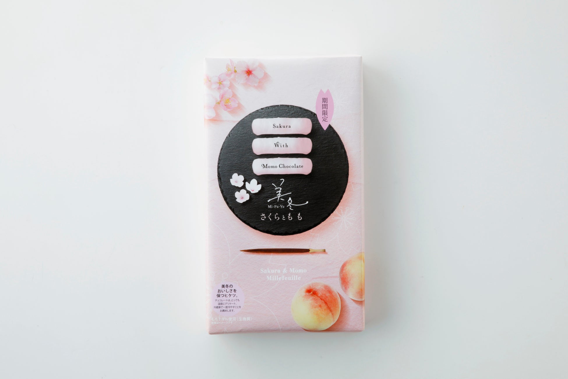 ■概要:さくら風味のフィリングとサクサクのパイを重ね、もも風味のホワイトチョコレートでコーティングしました。さくらの春らしい香りとももの豊かな風味がマッチした、期間限定のミルフィーユです。