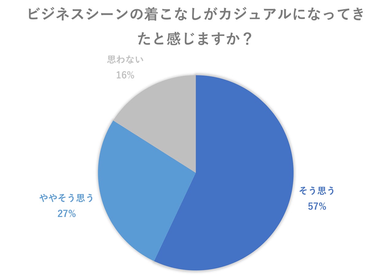 「そう思う」57%、「ややそう思う」は27%、「思わない」16%とビジネスシーンの服装がカジュアル化してきていると思う人が多い結果になりました。
