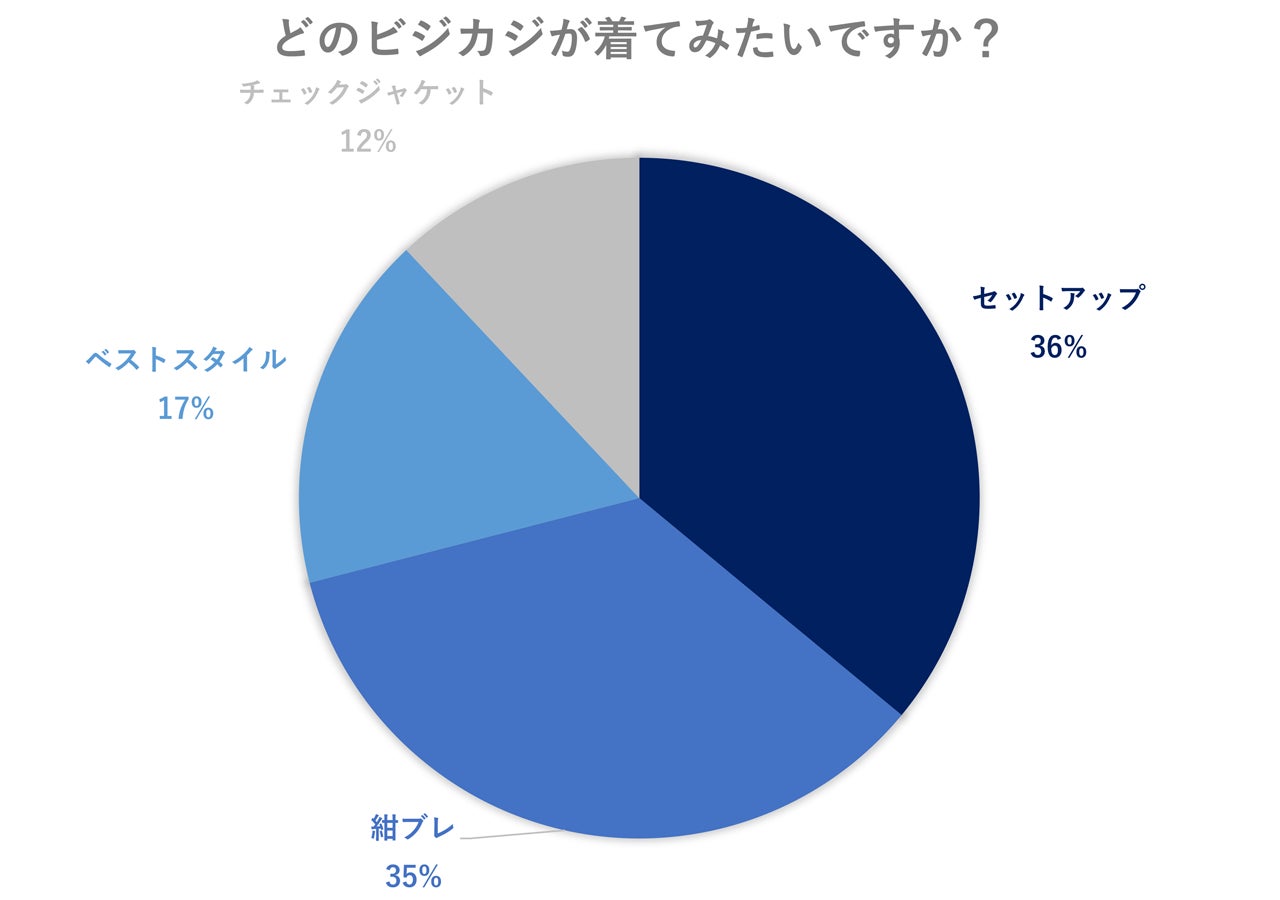 「セットアップ」が36%、「紺ブレ」が35%、「ベストスタイル」が17%、「チェックジャケット」が12%の回答となり、近年流行しているセットアップと、王道の紺ブレスタイルがほぼ同票で人気という結果に。