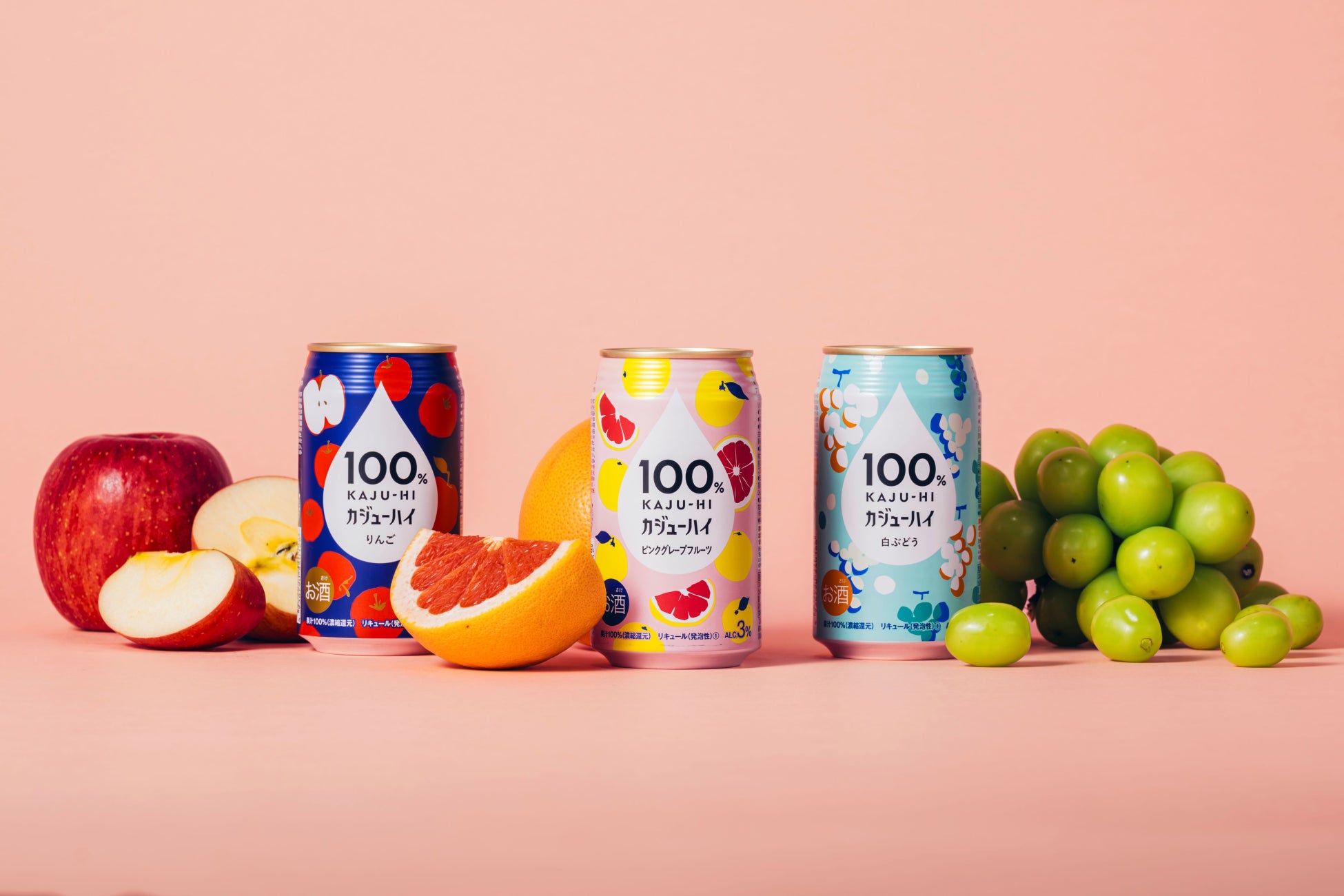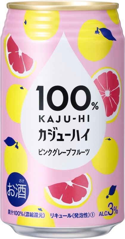 『100% カジューハイ』は果実のめぐみ(濃縮果汁)をお酒で割るから「カジューハイ」と名付けられた、新しいカテゴリーのお酒として2023年9月に登場しました。果汁100%だから味わえる果実本来の豊かなめぐみと、アルコール度数3%の程よいアルコール感が特徴です。酔いすぎないから心地よくリラックスでき、果汁100%だから果実本来の美味しさが味わえる、リラックス感と贅沢さを融合させた特別なお酒です。