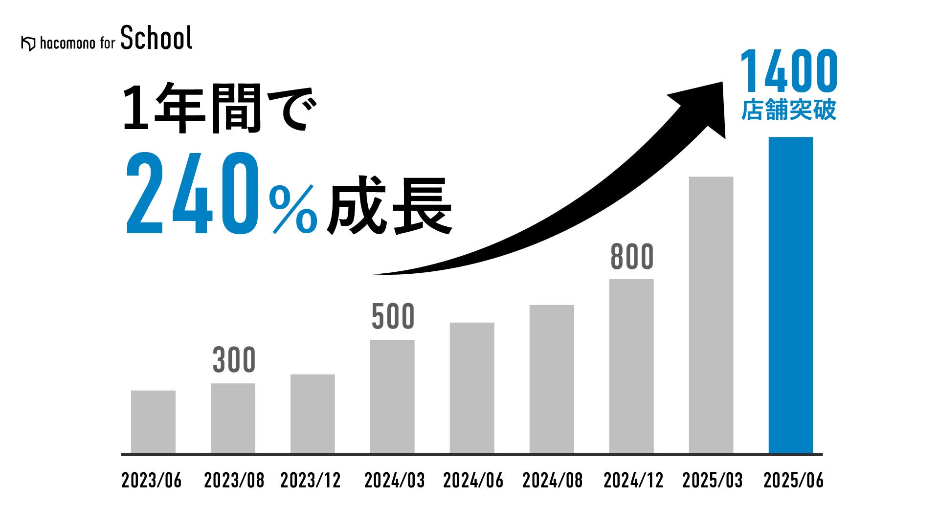キッズスクールプラン開始より、順調に導入店舗様を拡大。2025年6月現在1,400店舗を越えるスクール様に導入いただき、対前年同月比240%と成長し続けています。