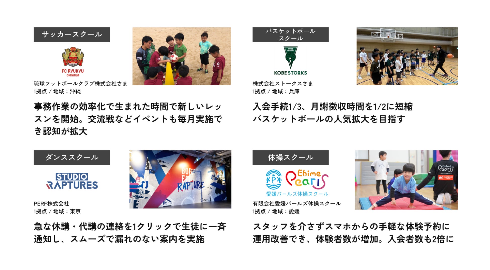 特に、JリーグやBリーグといったプロチーム傘下のキッズスクールでも導入が進んでおり、サッカーで10チーム、バスケットボールで5チームのスクール様にご利用頂いております。