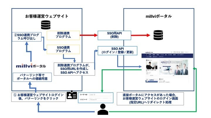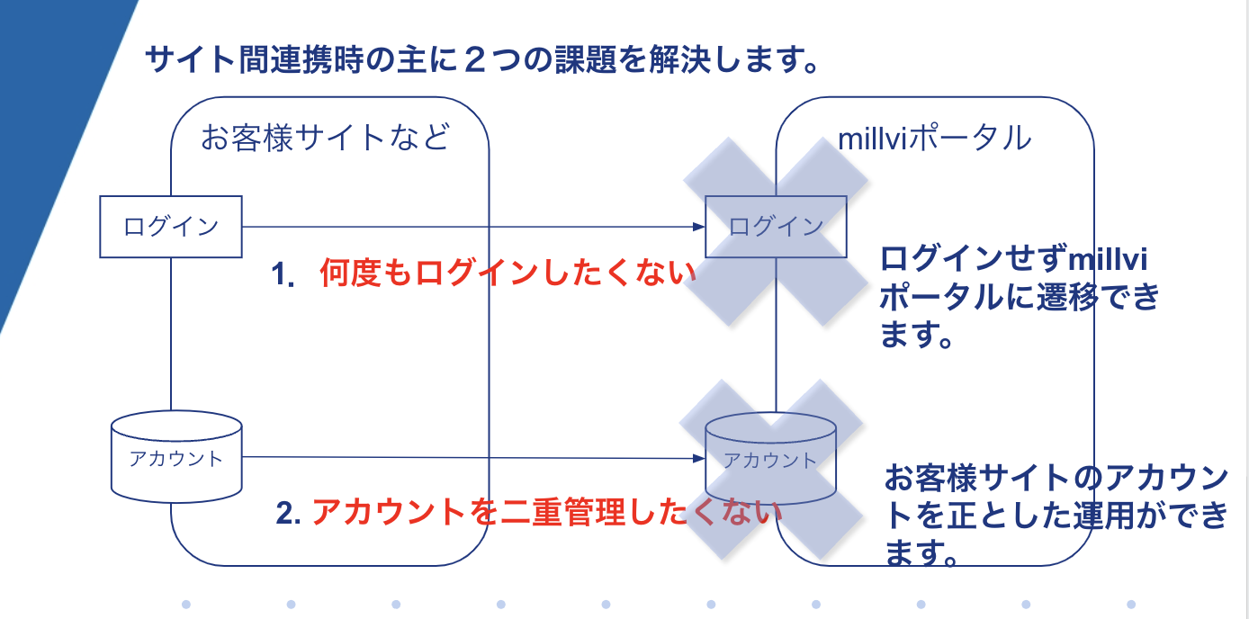 下図のようにお客様保有のシステムとmillviポータルをSSO連携するとお客様のシステム内に保有するアカウント情報をマスタとしてmillviポータルを管理することができます。これはセキュリティの向上や管理コストの削減のみならずユーザーの利便性を向上するのに役立ちます。