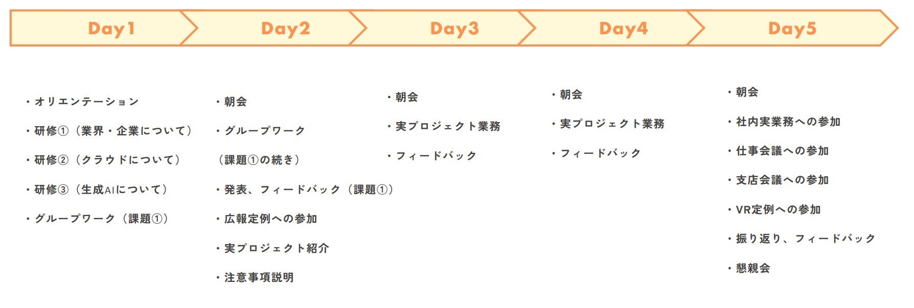 インターンシップでは、生成AI活用研修や課題解決型クラウド研修を実施します。AIの基本から実務での活用方法を学び、企業課題をクラウドを使って解決する方法を体験、「講義受講→構成図作成→発表→フィードバック」という流れで進めていきます。