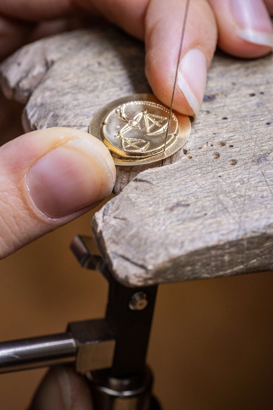 成形後、メダルに繊細な風合いをもたらすべく、細心の注意を払ってゴールドに再加工が施されます。これにより、レリーフのモチーフが表面に浮かび上がり、さらに丹念な研磨によって高められた貴金属の輝きが、モチーフを一層鮮やかに際立たせます。
