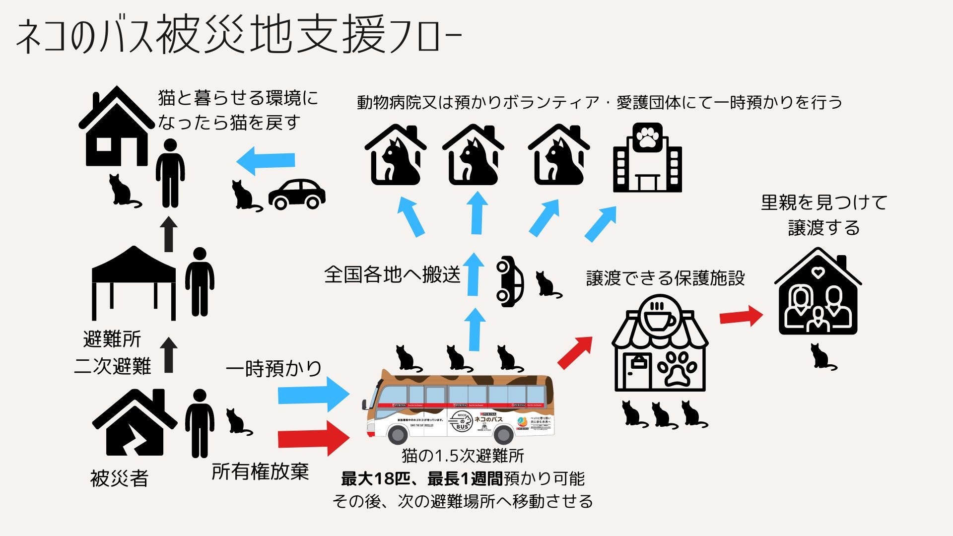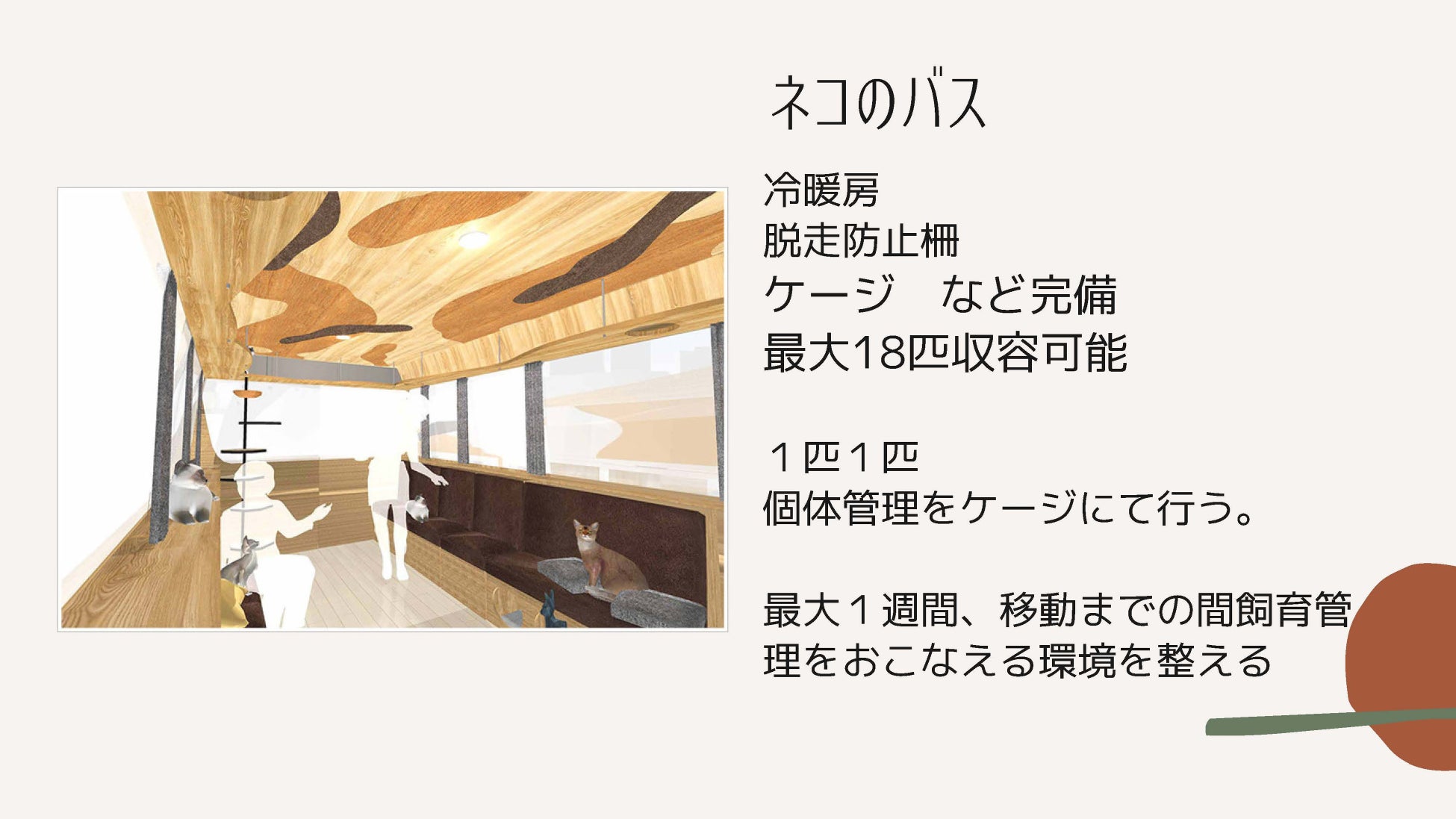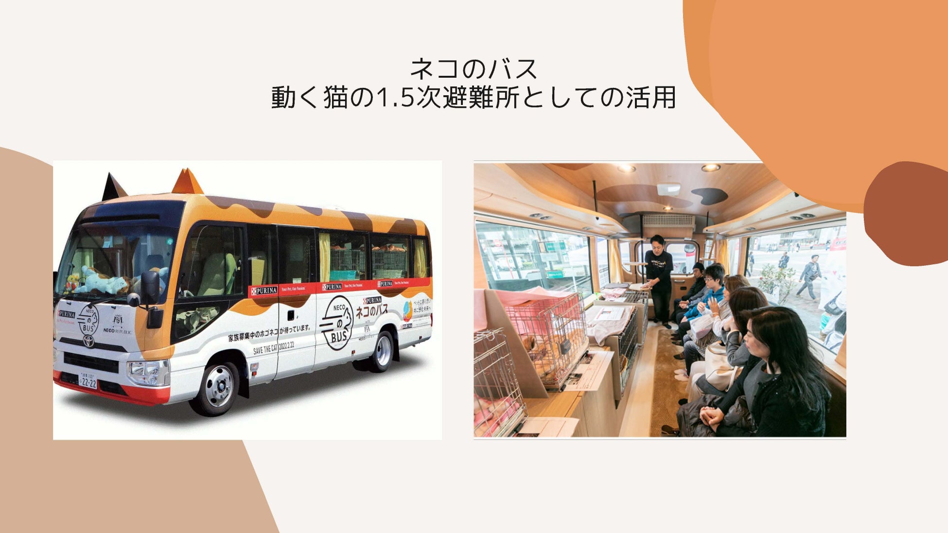ネコのバスの活⽤。猫の一時預かり場所への移動までの1.5次避難場所に