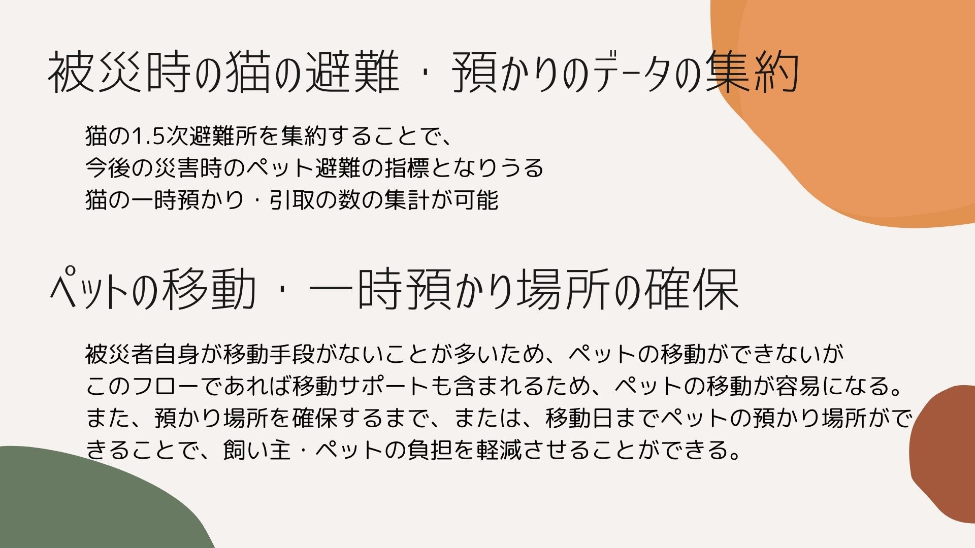 また、民間、個人などで、保護された猫の県外への移動を行っているが、そういった数の集計を行うことで、災害時の保護活動の集約化および効率化、トラブルの防止につなげることができる。