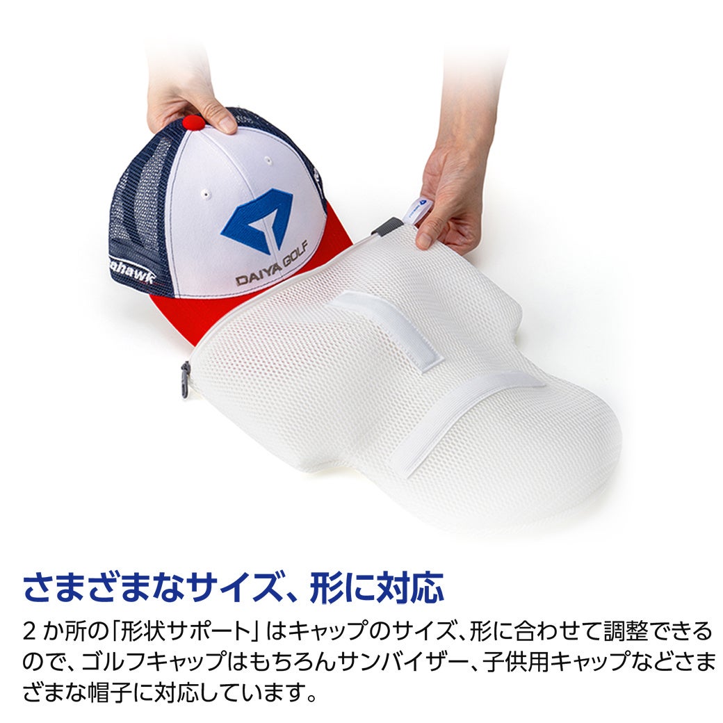『ゴルフキャップランドリーネット』は、高さ約18cm、ツバの長さ約11cm、ツバの幅約19.5cmまでの帽子サイズに対応しており、ゴルフキャップはもちろんサンバイザー、フラットキャップやワークキャップ、ハンチング、子供用から高さのある大きいサイズ、ツバが長いキャップなど様々なデザインの帽子が自宅で洗濯できます。
