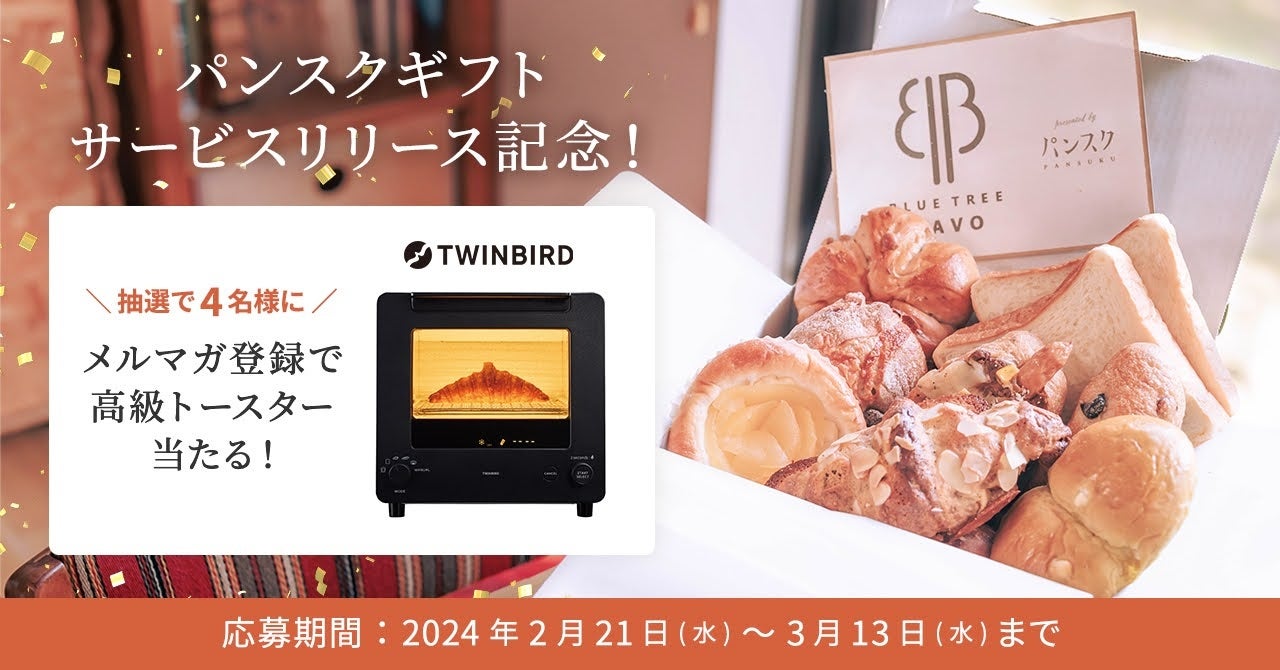 パンスクギフトの開始を記念して、パンスクがお届けするメールマガジン『パンスクレター』を新規にご登録いただいた方を対象に、ツインバード社の「匠ブランジェトースター」のプレゼントキャンペーンを開催します。