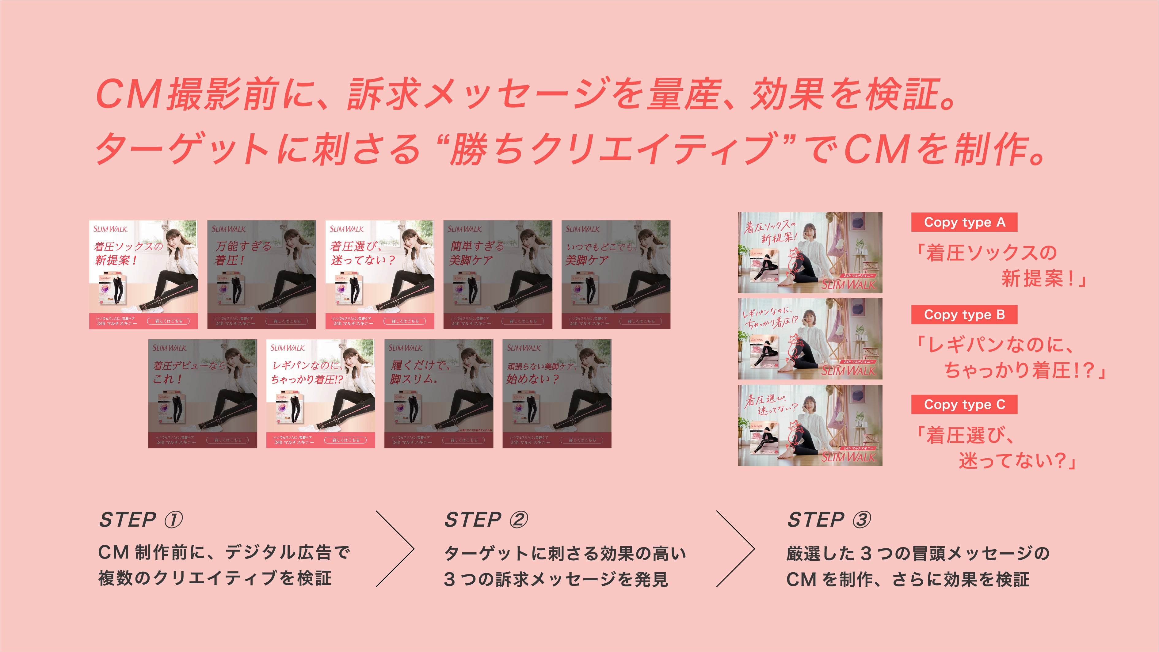 “CM制作前”にデジタル広告で事前に検証。テストの成果が出た訴求メッセージをCMのコピーに採用。