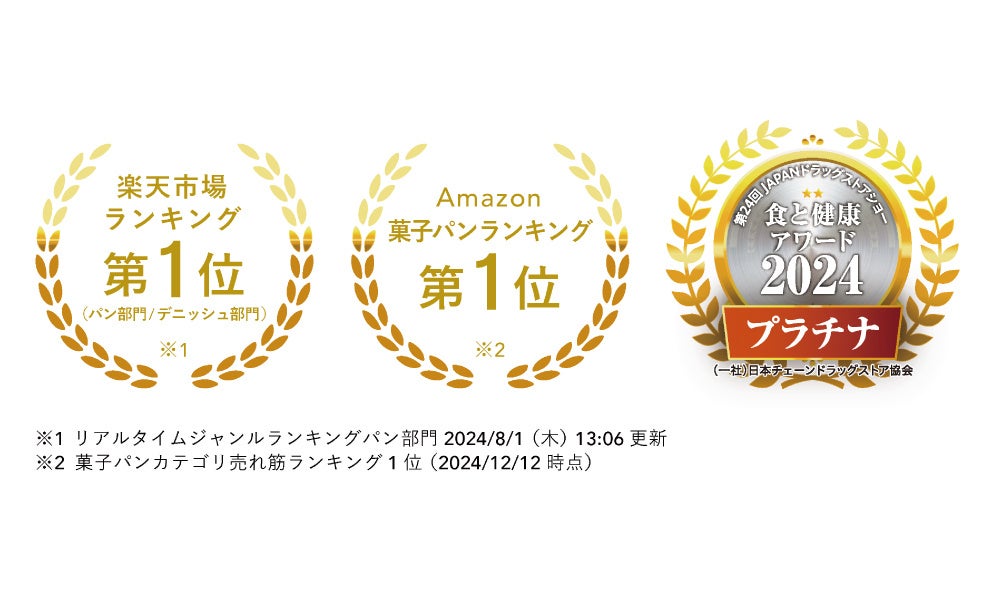 2024年8月の販売開始以降、Amazon、楽天市場、Qoo10などのECモールにて各カテゴリで1位※を獲得してきました。また、第24回JAPANドラッグストアショー「食と健康アワード2024」ではプラチナ賞を受賞するほか、有楽町にて実施した期間限定POP UP ショップでは実施したキャンペーンによるSNS上での反響で一時在庫切れになるなど、健康志向かつ美味しいものを求める方々にも満足していただける新しいパンとして注目を集めています。