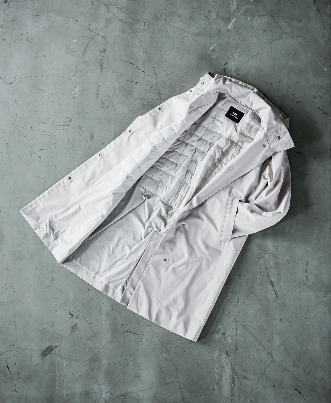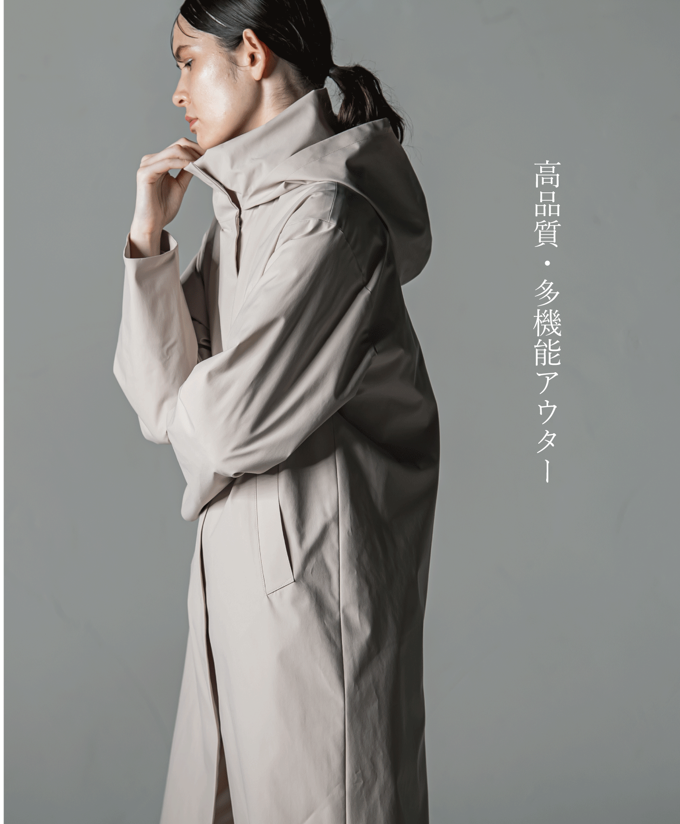 ロングコート。 フードはスタンドカラーの中に収納できるので、いろんなコーデで楽しめる。