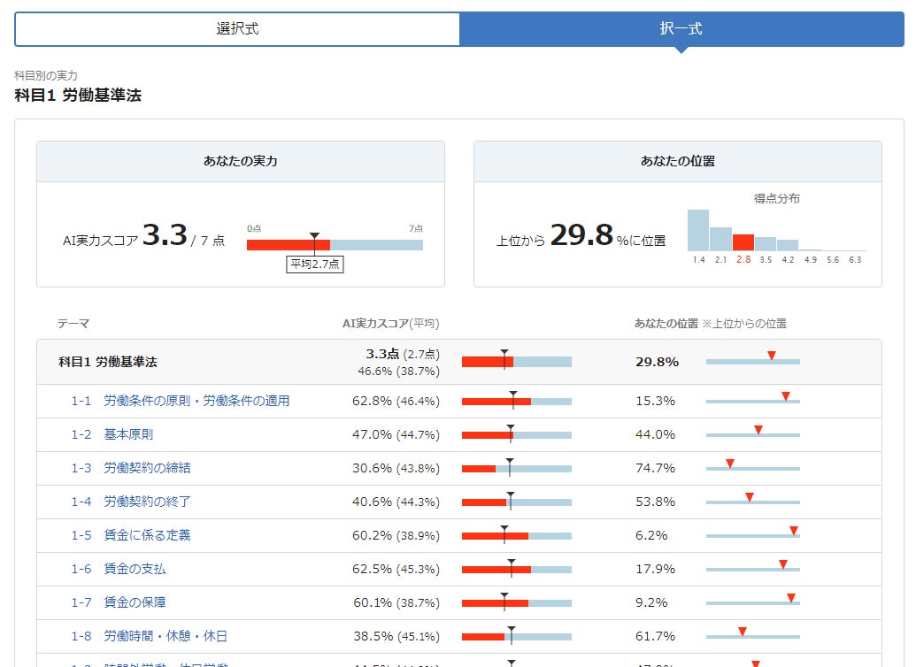 社会保険労務士試験は、「選択式試験」と「択一式試験」の2つの試験で合否が問われます。AI実力スコアでは、「選択式試験」「択一式試験」それぞれの試験毎にスコアを見ることができるので、よりピンポイントで無駄のない対策を行えます。もちろん、科目別や細かいテーマ別のスコアを見ることも可能です。これにより、苦手なテーマを把握して、効率的に試験勉強をすることが可能です。