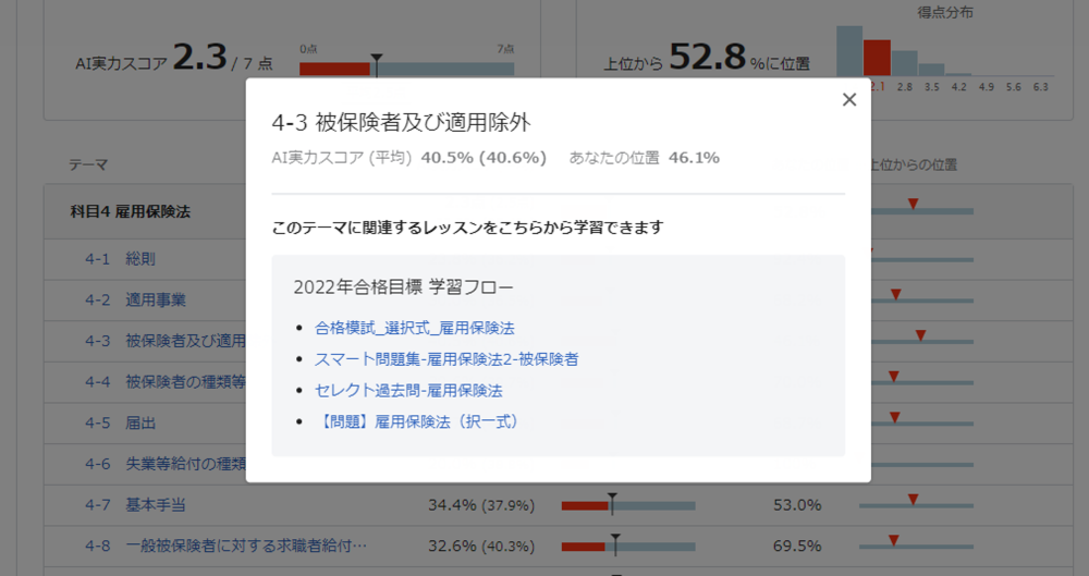 *2 : テーマ別スコアは、そのテーマに関連する問題を、1回でも学習した受講者の中での位置を表示しています。