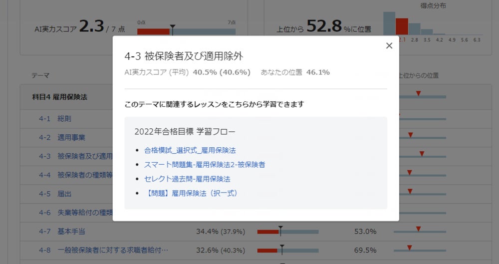 「AI実力スコア」では、全体スコア、科目別スコア*1、テーマ別スコア*2について、全受講者中(過去1年間以内に学習した受講者中)の「あなたの位置」を表示します。これにより、他者と比較したときの、自分の強み・弱みがわかるため、さらに効率的な学習が可能になります。