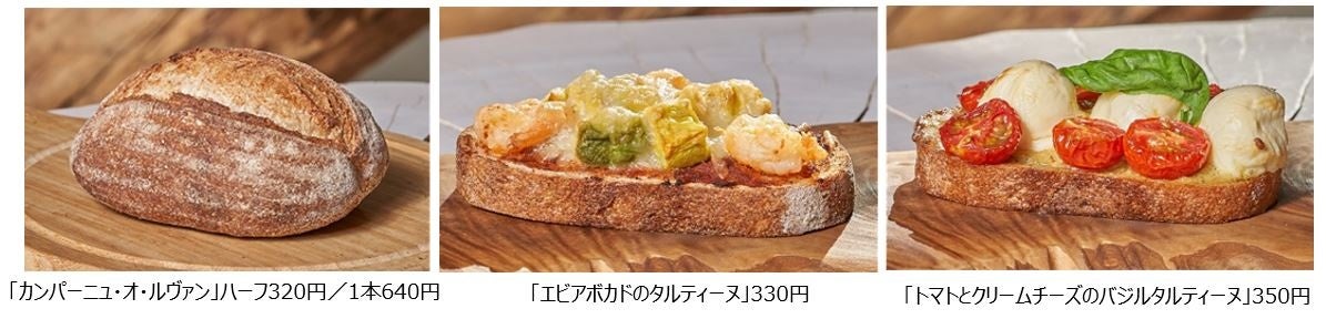 小麦の香りを引き立たせた、同店自家製のルヴァン発酵種を配合した小麦粉を30%使用した「カンパーニュ・オ・ルヴァン」を販売。この他に、カンパーニュにボロネーゼ、エビ、アボカド、シュレッドチーズをトッピングした「エビアボカドのタルティーヌ」や特製バジルソースを塗り、トマトとクリームチーズを乗せ焼き上げ、仕上げにフレッシュバジルをトッピングした「トマトとクリームチーズのバジルタルティーヌ」の総菜パン2種も販売します。