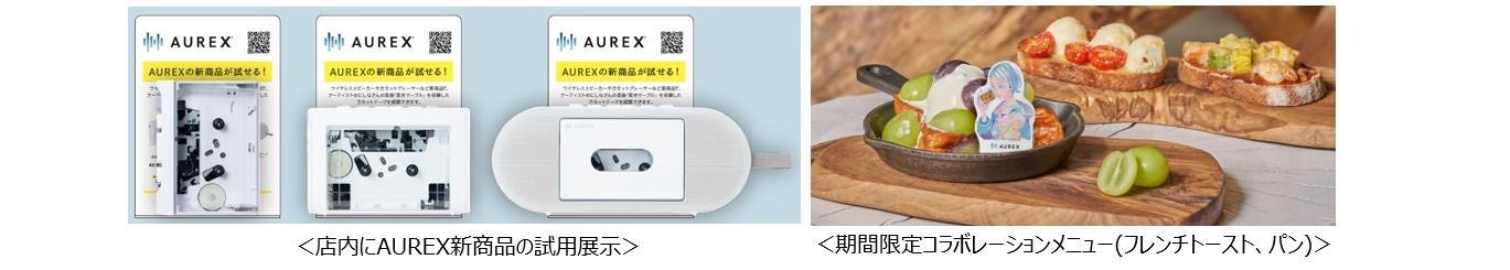 また、音楽を楽しみながら「心、躍る。」世界と時間を過ごせるように、AUREXとのコラボレーションメニューとして、同店の看板メニュー「フレンチトースト」をアレンジした「シャインマスカットのフレンチトースト」をイートイン限定で提供。石窯ドームとのコラボレーションメニューとしては、同店監修「カンパーニュ・オ・ルヴァン」と、カンパーニュをアレンジした2種の総菜パンを販売します。