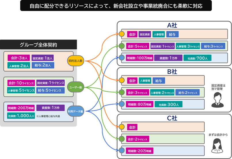 『奉行V ERPクラウド Group Management Model』では、利用ライセンス数やデータ容量などのリソースをグループ全体で契約し、各社に自由に配分できるライセンス体系を提供します。