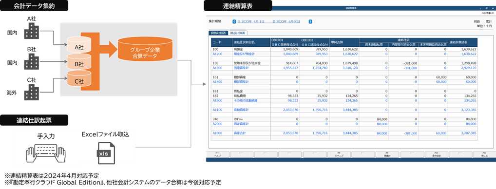 『勘定奉行V ERPクラウド』はもちろん、海外子会社向けの勘定奉行『勘定奉行クラウド Global Edition』や他社会計システムを含む、グループ全社の財務情報をリアルタイムに集約し、連結消去仕訳を反映した連結精算表まで作成できます。さらに、事業や地域などのセグメントを軸にグループ全社を横断的に比較・分析できるため、グループ全社の業績把握、経営戦略立案に活用できます。