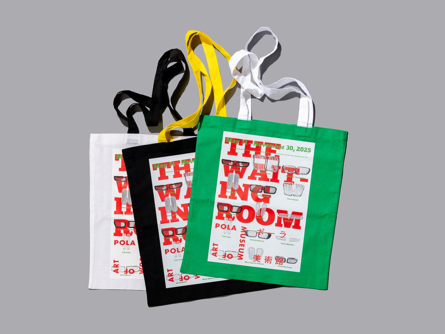 本展のために作家が制作した《幾多の野望たちの亡霊(待合室)》から、空想の展覧会ポスターをプリントしたトートバッグ。
