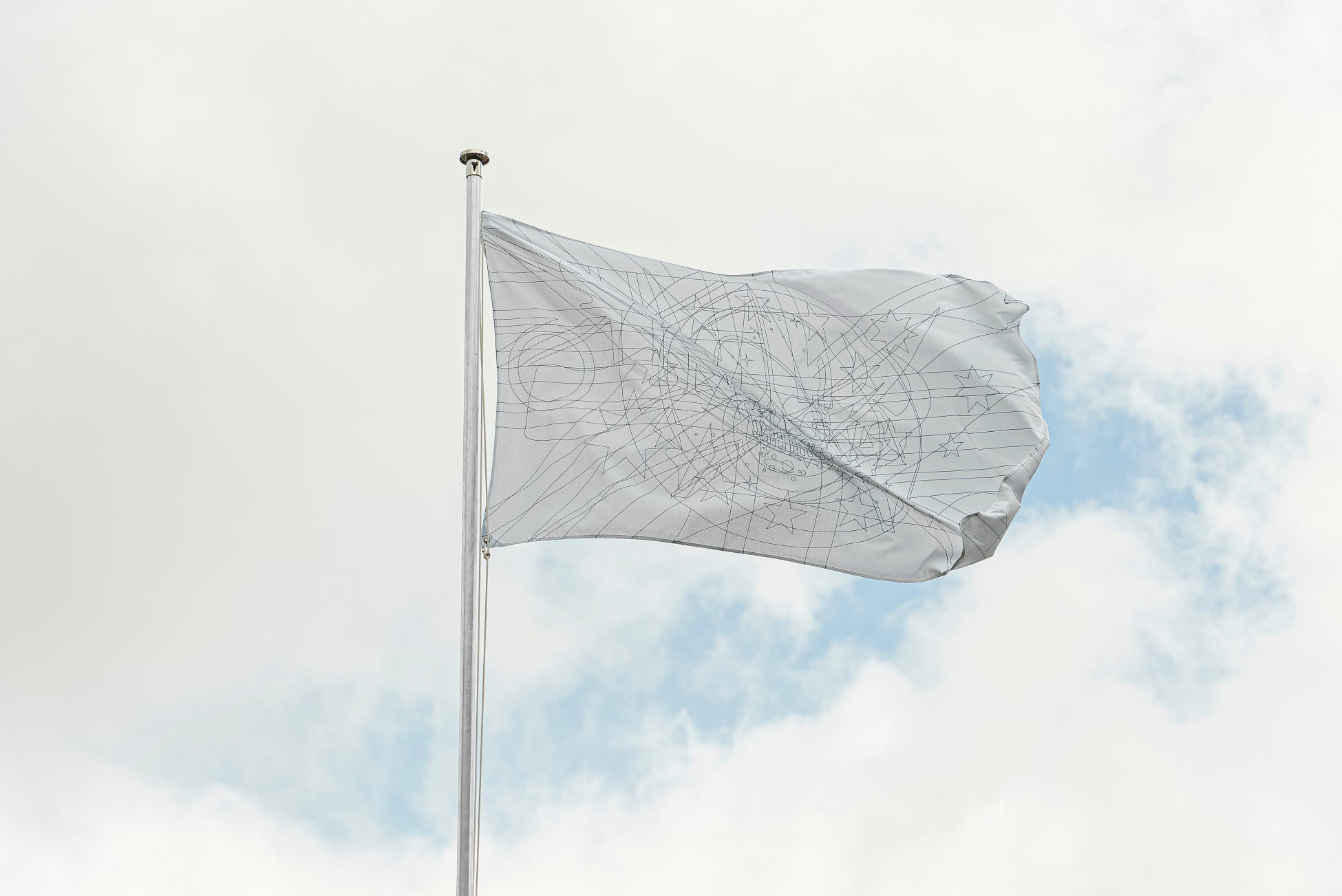 《周縁を中心に据えて》をモティーフにしたトートバッグ。実在するものからフィクションの世界に登場するものまで、さまざまな旗のデザインが組み合わされています(写真右)。