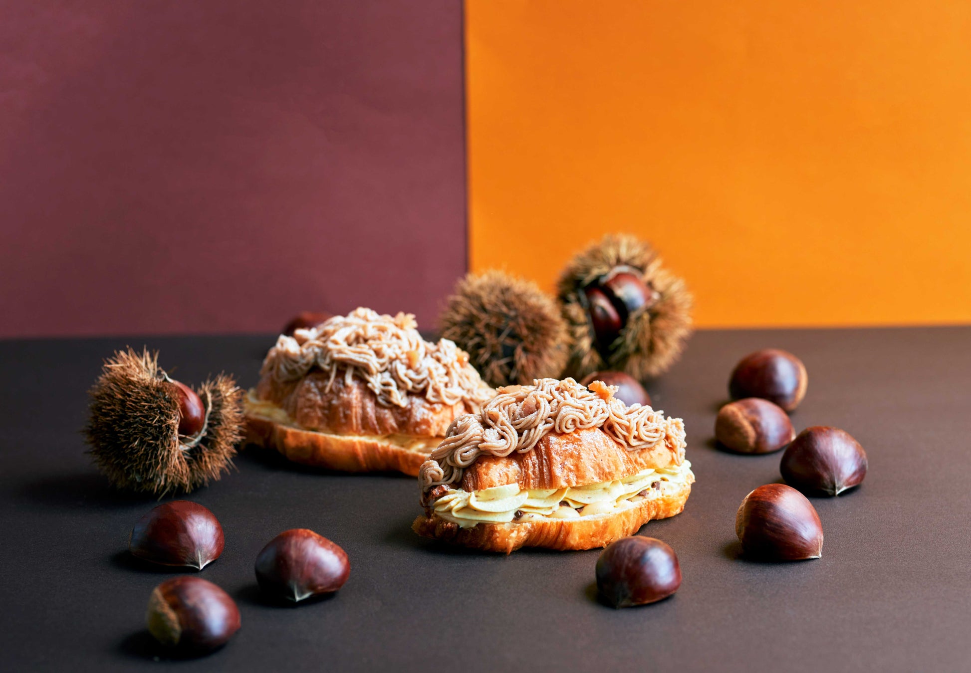 国産の発酵バターを使用し、あえて8層仕立てで軽やかな食感を出したクロワッサンの中に、下からカスタード、花のような香りを持つビターチョコレート、山鹿の和栗の生クリームを重ね、上には和栗のモンブランを絞り、和栗の甘露煮を載せました。ケーキのような贅沢なデザートクロワッサンです。