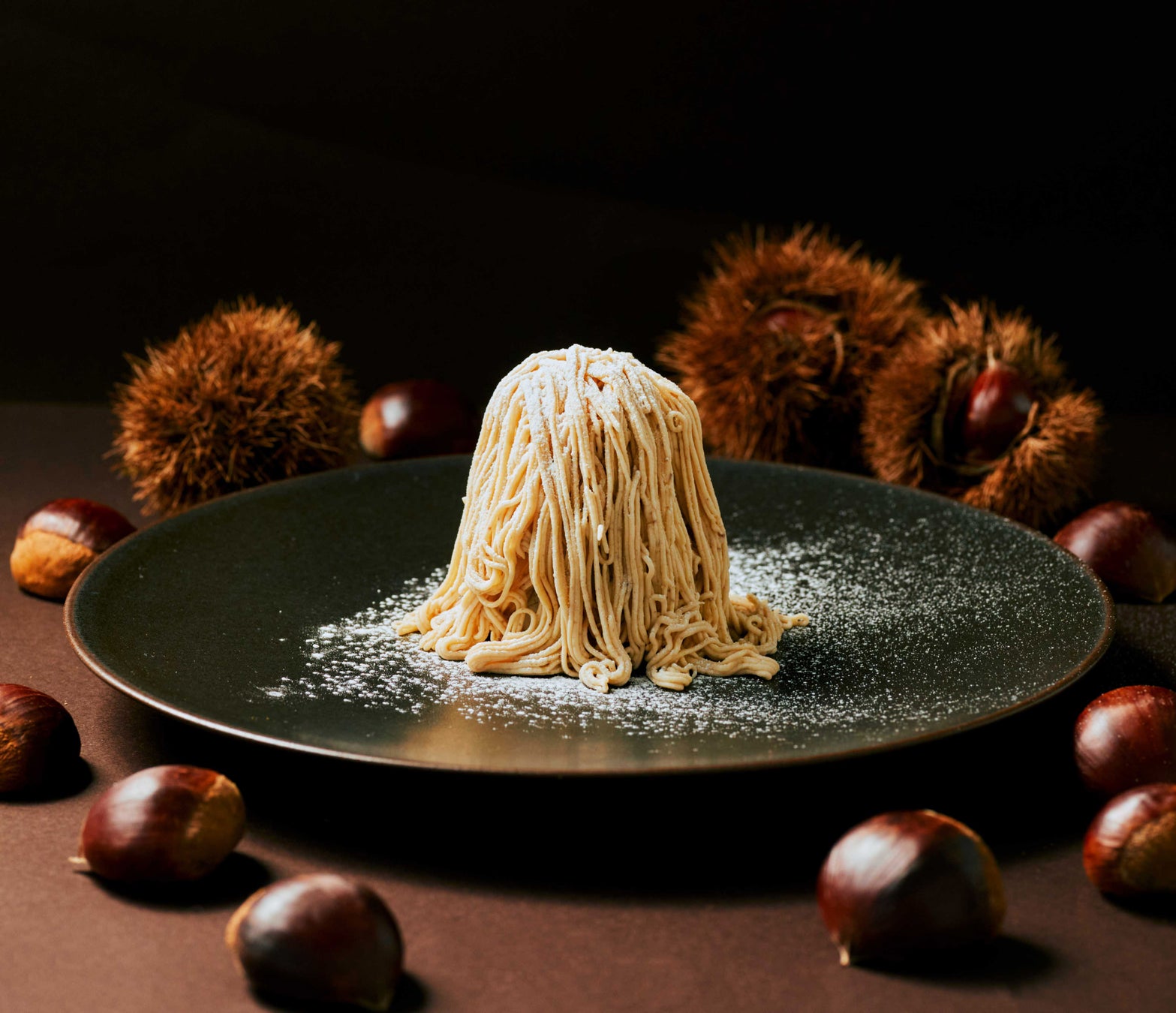 「栗そのものよりも栗を味わえるモンブラン」をコンセプトに、山鹿の和栗、生クリーム、カカオビネガーのシンプルな材料で作った一品。栗の王様とも称される味の濃い和栗を収穫から1ヶ月間、0℃で熟成させることで糖度を一気に上げ、甘みと旨みを引き出しました。中にはカカオの果実部分で作ったフルーツビネガーを加えた、すっきりフローラルな香りの生クリームを忍ばせています。搾りたての栗のペーストと生クリームで賞味期限はわずか3分!崩れる前にお召し上がりください。