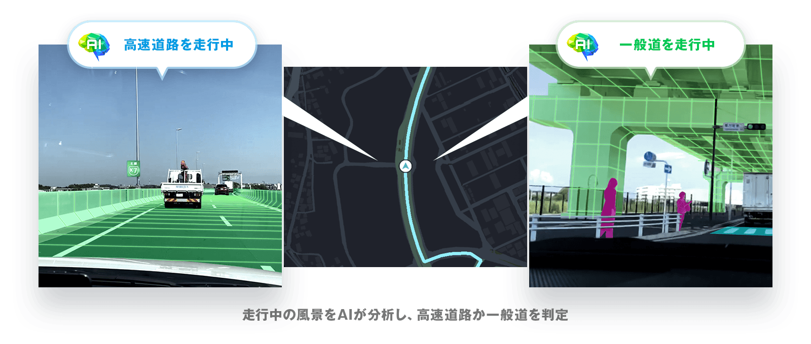 そこで、画像から位置を測定するVPS(Visual Positioning System)技術を活用し、撮影中の周囲の風景が高速道路か一般道かなどをAIでリアルタイムに解析することで、自車位置測位の精度を向上しました。高架上の高速道路とその下の一般道など、地図上で重なり合った道路などでも、現在走行中の道路を正確に判定し、最適な自車位置表示およびARナビゲーションを行うことが可能になります。