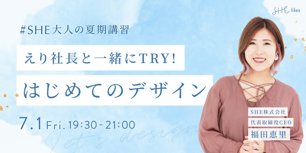 本夏期講習は、主にSHElikes(シーライクス)の教材を参加者がzoom上で同時に視聴し、共同学習を通じて学びを深める形式で実施致します。7月1日(金)に実施する第1弾「えり社長と一緒にTRY!はじめてのデザイン」には、SHE代表取締役CEO・福田恵里が講師として登壇し、無料で一般開放いたします。
