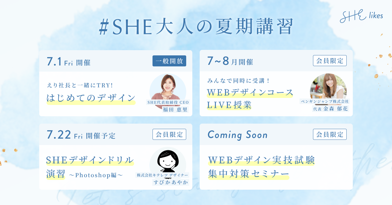 SHE、WEBデザインを共同学習スタイルで学ぶ「#SHE大人の夏期講習」を開催