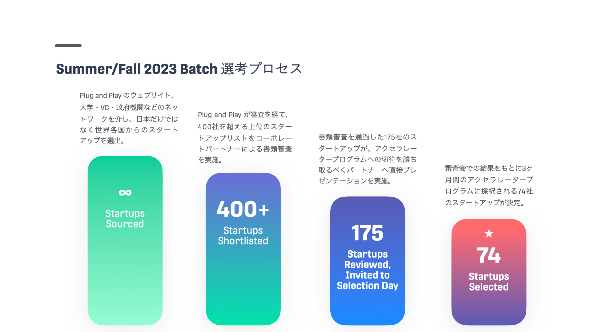 *Batchとは、Plug and Play Japanにおいて、アクセラレータープログラム期間を表す単位。