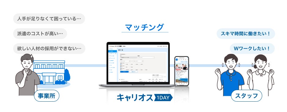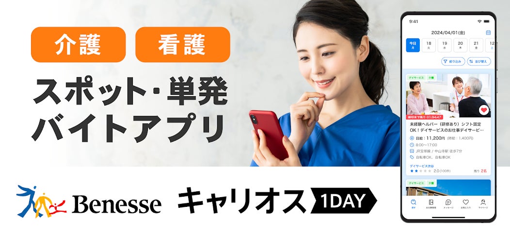 「キャリオス1DAY」は、すぐに人手が欲しい事業所と介護・看護の有資格者をマッチングする、介護・看護業界特化型スポット・単発バイトのマッチングサービスです。急な人員不足や慢性的な介護職・看護職の人手不足も解決に導きます。