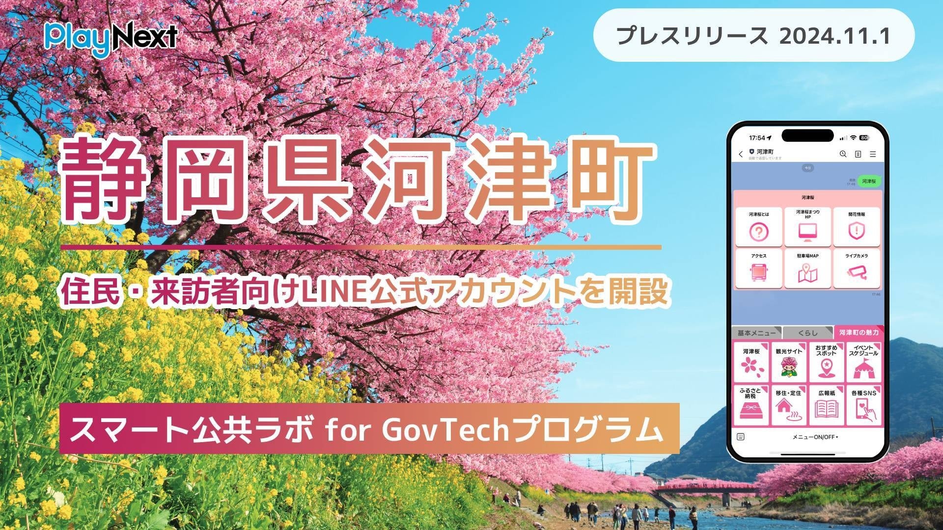プレイネクストラボ株式会社(本社:東京都品川区、代表取締役:柏 匠、以下 「プレイネクストラボ」)の提供する「スマート公共ラボ for GovTechプログラム」が、静岡県河津町(以下「河津町」)のLINE公式アカウントに採用され、2024年11月1日(金)より一般公開したことをお知らせします。